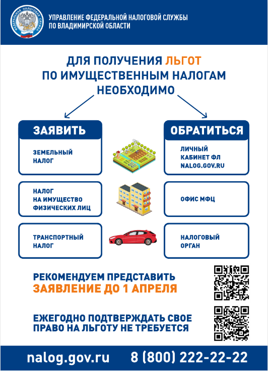 УФНС России по Владимирской области напоминает, что отдельные категории граждан имеют право на налоговые льготы и вычеты по имущественным налогам.