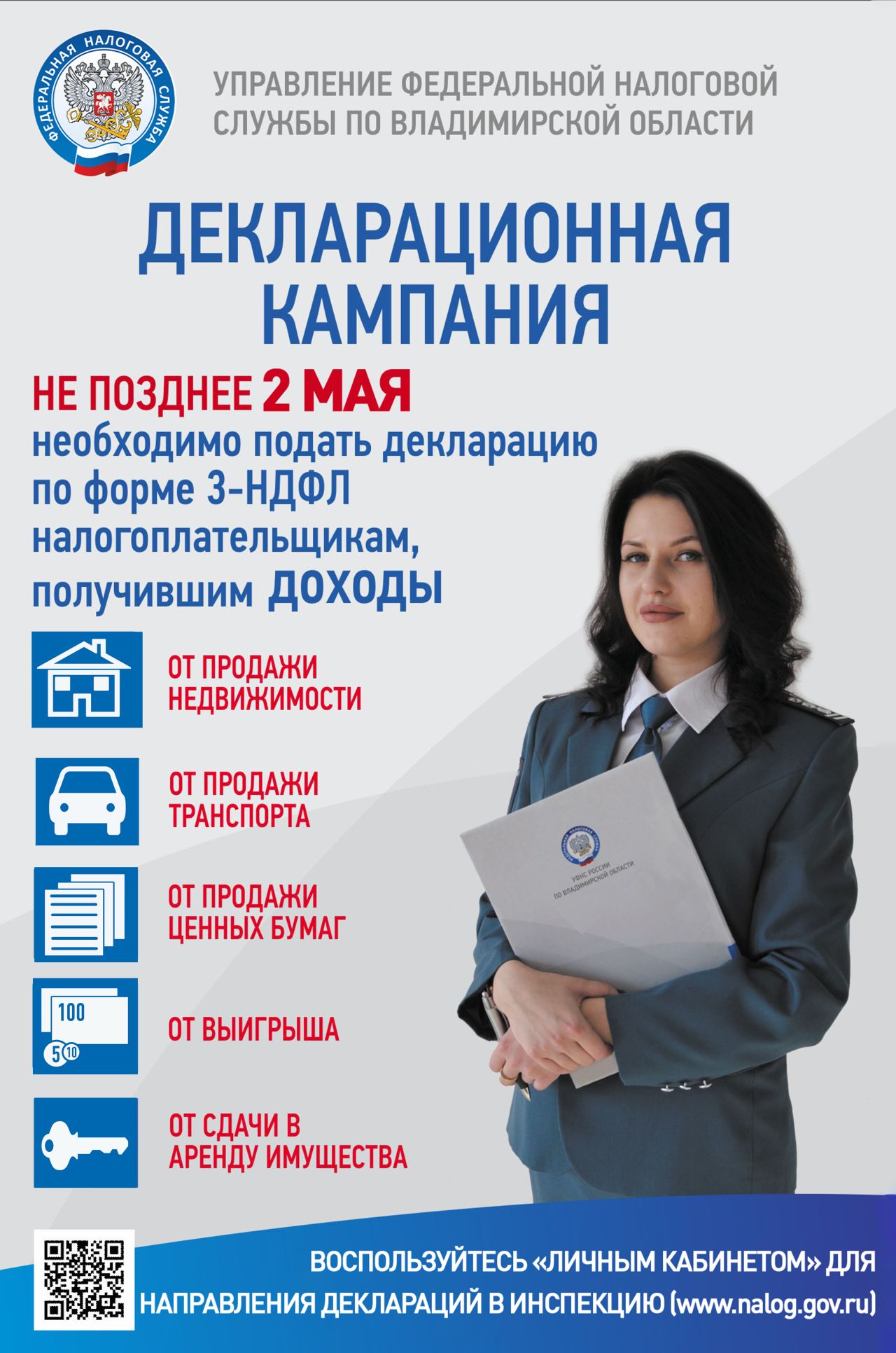 Управление Федеральной налоговой службы напоминает, что представить декларацию о полученных доходах по форме 3-НДФЛ необходимо не позднее 2 мая.