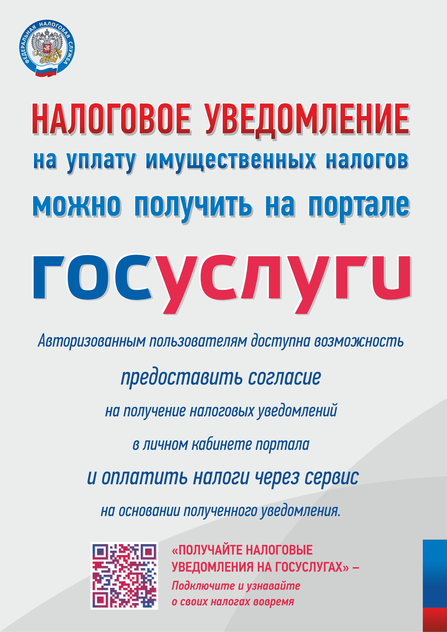 УФНС России по Владимирской области информирует, что в соответствии с Федеральным законом от 14.04.2023 № 125-ФЗ, начиная с 1 июля 2023 года, предоставлена возможность получения налоговых уведомлений для уплаты налогов на имущество и НДФЛ, а также требований об уплате задолженности по налогам физическими лицами в электронной форме через личный кабинет на Госуслугах.